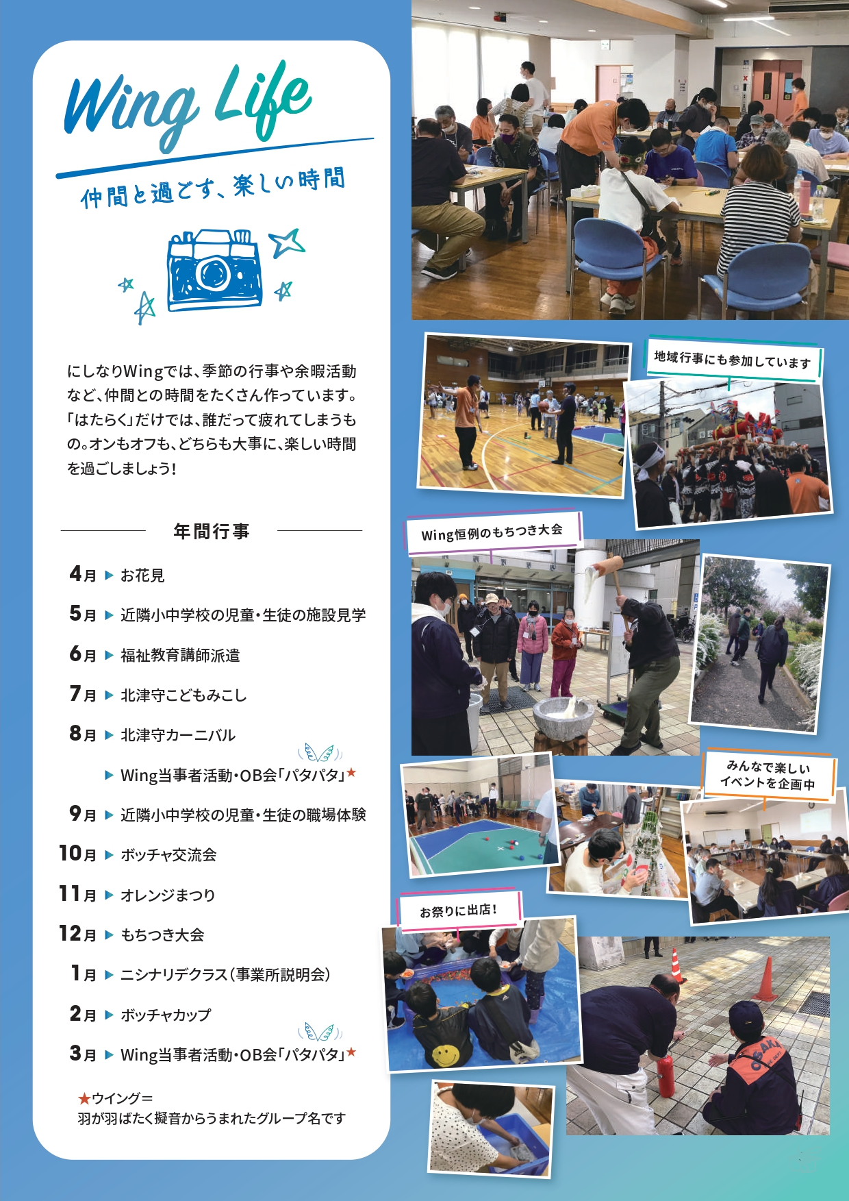 にしなりWingでは、「働く」ことと同じくらい、仲間との豊かな時間も大切にしています。季節ごとのイベントやさまざまな余暇活動を通じて、オンとオフのメリハリをつけ、心身ともにリフレッシュし、充実した日々を過ごせるようサポートします。
