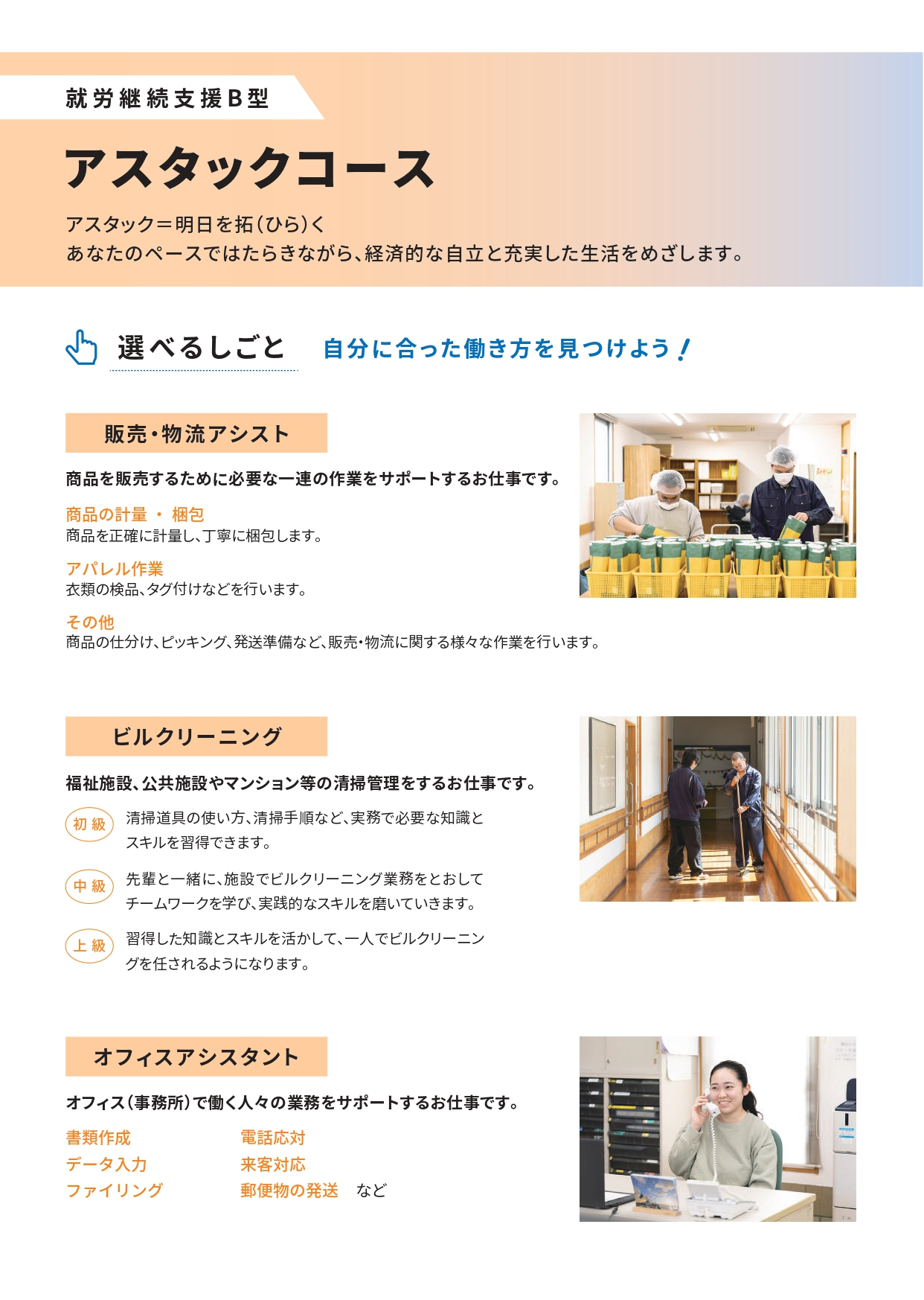 にしなりWingのアスタックコースは、(就労継続支援B型)として、あなたのペースで働きながら、経済的な自立と充実した生活の実現を目指すコースです。「アスタック」とは「明日を拓(ひら)く」という意味が込められています。