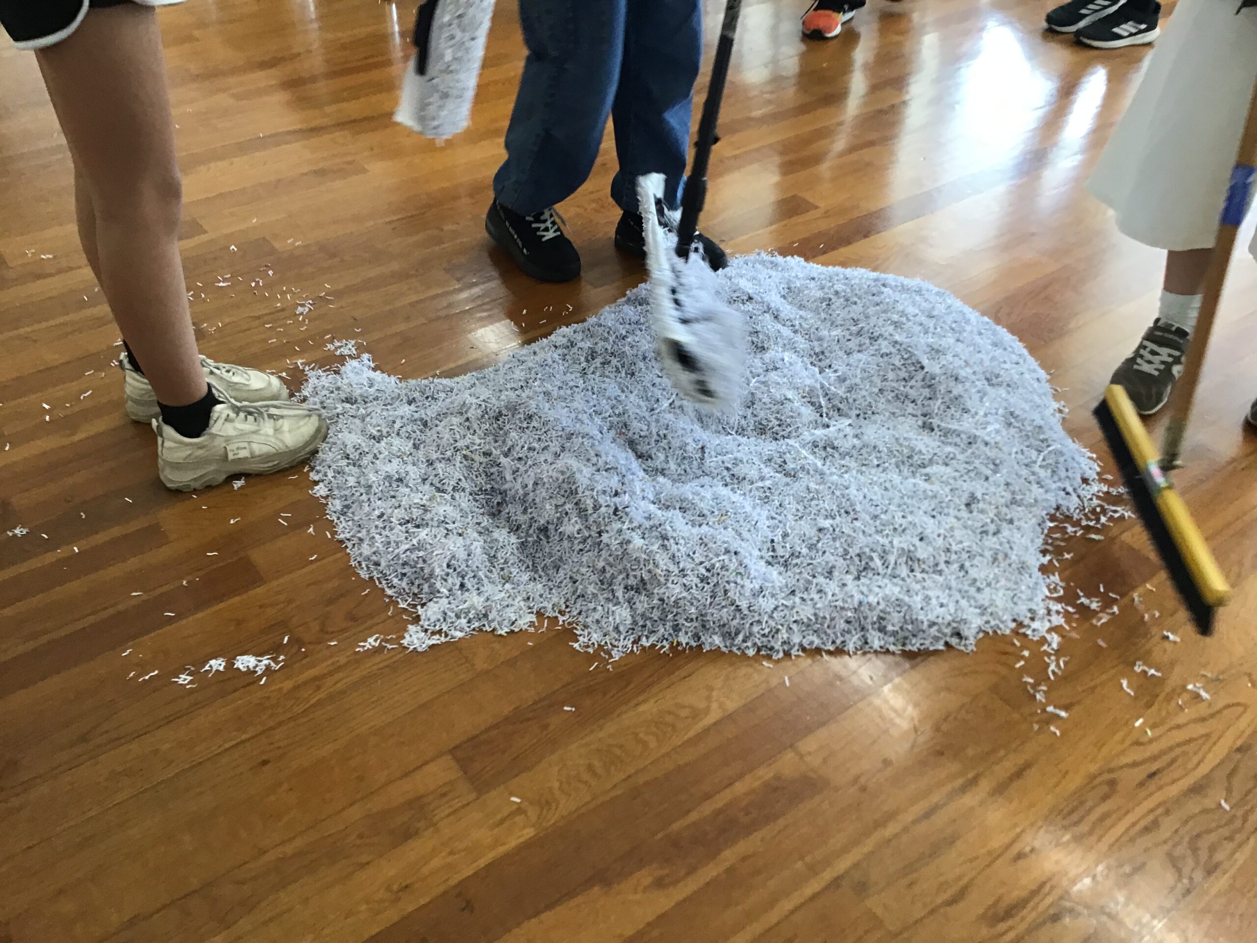 ビルクリーニングでは、ゴミに見立てた紙くずをほうき・ダストモップで掃きとる体験をしてもらいました!