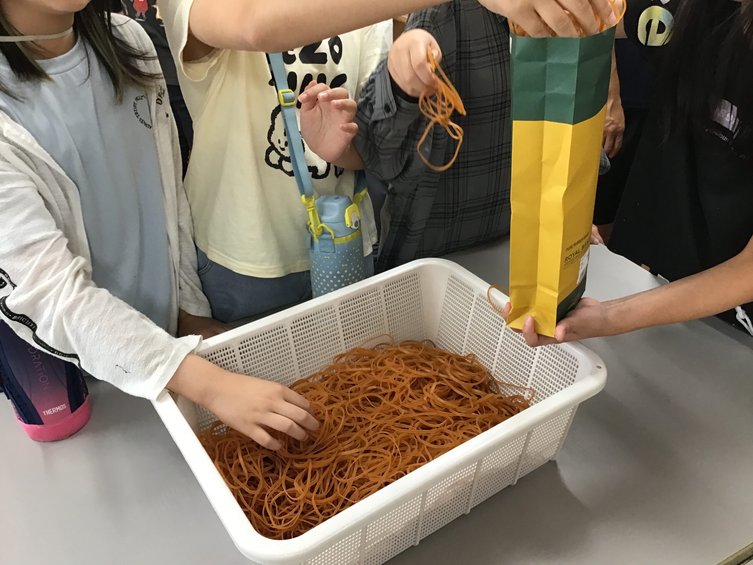 物流アシストでは、輪ゴムの軽量を体験してもらいました!