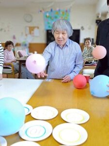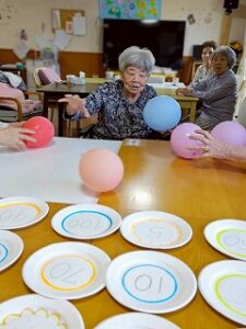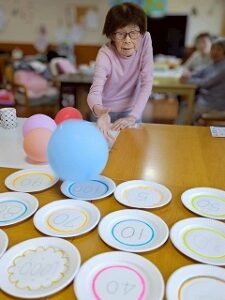 紙皿に点数を書き風船には、ビー玉を入れて膨らませたら完成!