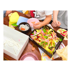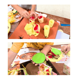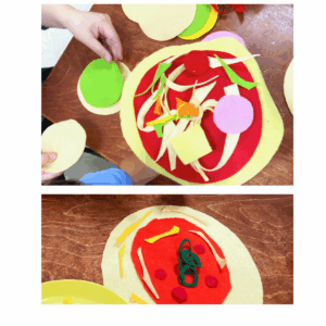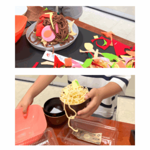 最初に食べ物の絵本を読み聞かせしたり、ピザやおうどんの写真を見てイメージを膨らませ、同じように作るところからスタートしました。