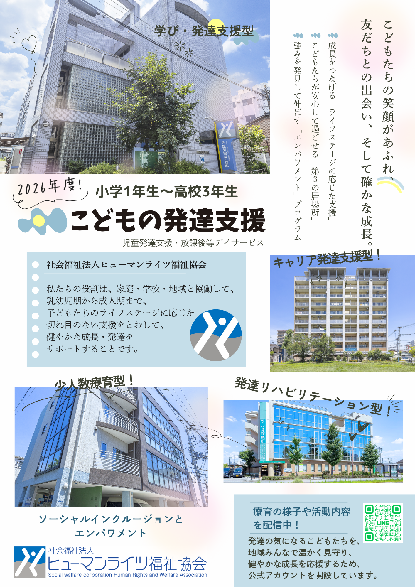地域福祉の中核を担う社会福祉法人だからこそ、私たち社会福祉法人ヒューマンライツ福祉協会は、「ソーシャルインクルージョン(社会的包摂)」と「エンパワメント」を理念に掲げ、家庭・学校・地域と協働し、乳幼児期から成人期まで切れ目のない支援を通じて、こどもたち一人ひとりの健やかな成長・発達をサポートしてまいります。