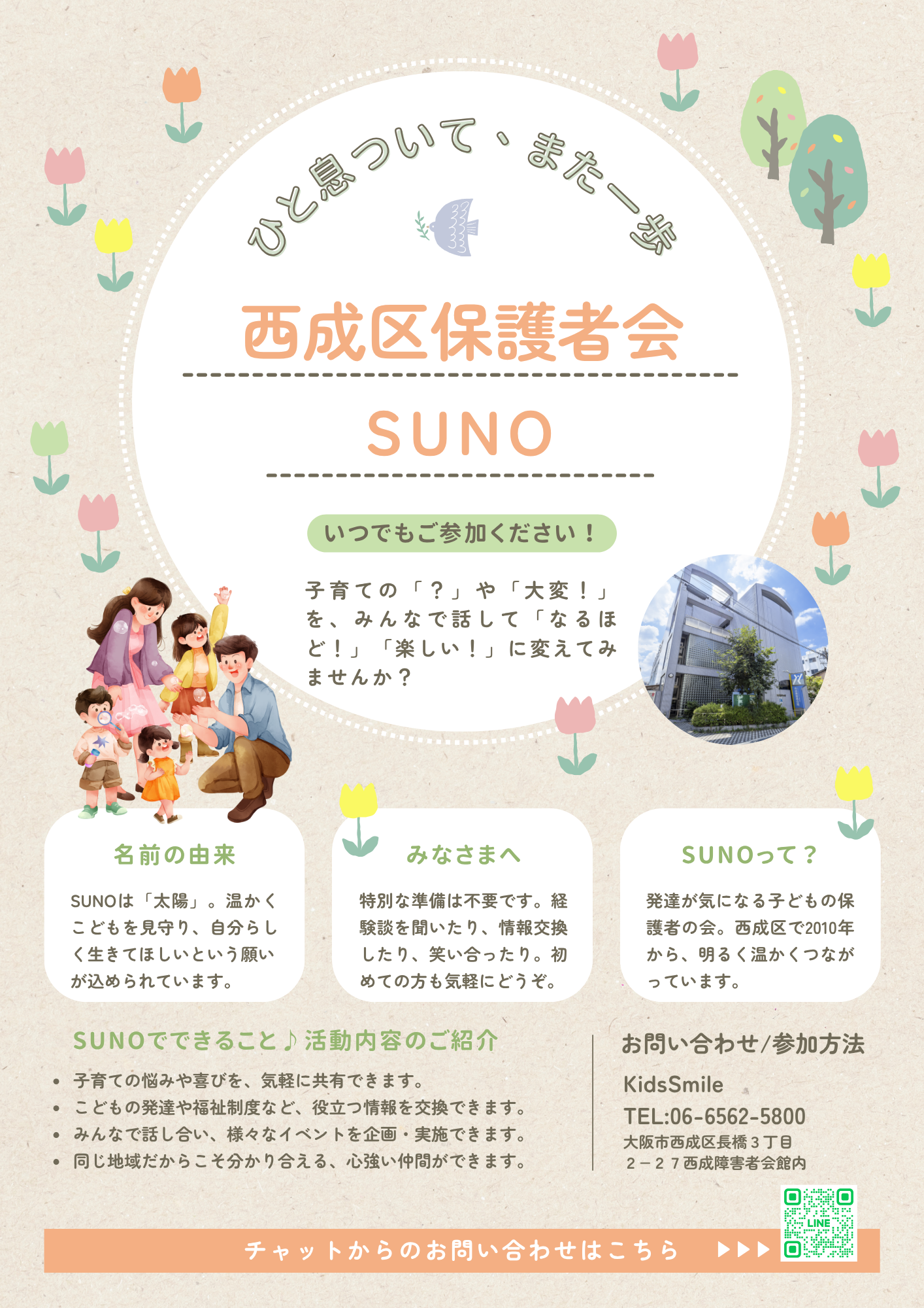 西成区保護者会SUNOは、発達が気になるお子さんの保護者の会です。2010年から西成区で活動を続け、温かくつながり、支え合ってきました。