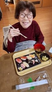少し早めの夕飯。皆さま久しぶりのお寿司に思わず笑みがこぼれます。(#^.^#)