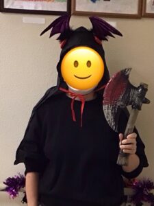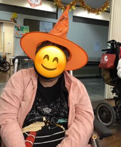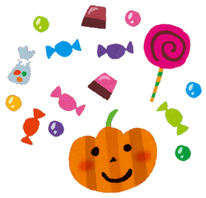 お菓子を用意し、好きなものを食べていただきました。準備段階で、「何あんの?」と見に来られる方が何人かいました。魔女の帽子をかぶったり、おもちゃの血の付いた斧を持ったり...。仮装も楽しまれていました。