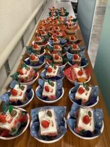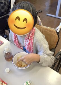 こちらも皆さん楽しみにされていたようで、「忘年会するの?」とたくさんの方から質問がありました。当日みなさんに笑顔でお菓子を食べていただきました。