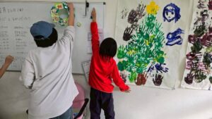 リース作りと並行して手形クリスマスツリーも作成し、次の日に行われるクリスマスパーティの壁面飾りとして使いました!