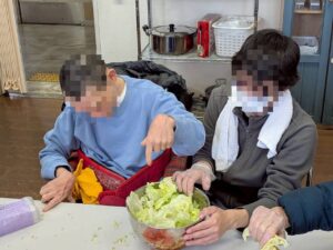 サラダ用に、レタスも手分けしてちぎっていきます✊
